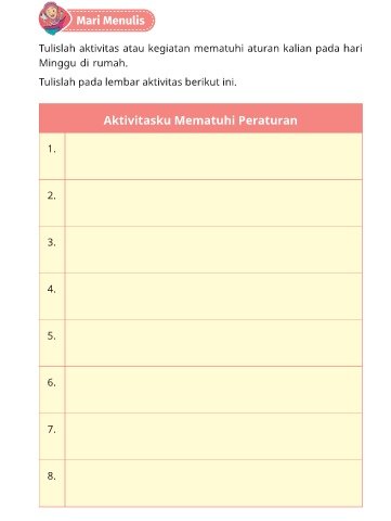 Mari Menulis Tulislah aktivitas atau kegiatan mematuhi aturan kalian pada hari Minggu di rumah. Tulislah pada lembar aktivitas berikut ini. Aktivitasku Mematuhi Peraturan 1. 2. 3. 4. 5. 6. 7. 8. Bab 1 Aku Patuh Aturan 23