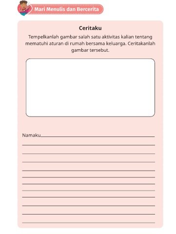 Mari Menulis dan Bercerita Ceritaku Tempelkanlah gambar salah satu aktivitas kalian tentang mematuhi aturan di rumah bersama keluarga. Ceritakanlah gambar tersebut. Namaku Bab 1 Aku Patuh Aturan 31