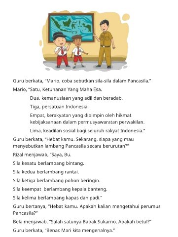 Guru berkata, “Mario, coba sebutkan sila-sila dalam Pancasila.”