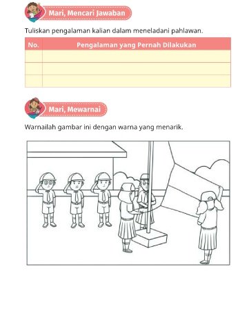 Mari, Mencari Jawaban Tuliskan pengalaman kalian dalam meneladani pahlawan. Pengalaman yang Pernah Dilakukan No. Mari, Mewarnai Warnailah gambar ini dengan warna yang menarik. Bab 2 Aku Berperilaku Pancasila 75