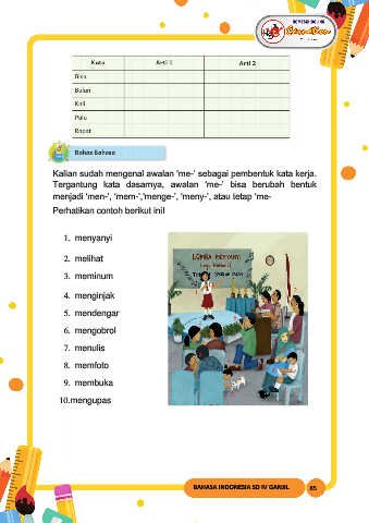 Kalian sudah mengenal awalan ‘me-’ sebagai pembentuk kata kerja.