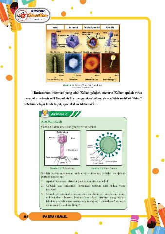 Berdasarkan informasi yang telah Kalian pelajari, menurut Kalian apakah virus merupakan sebuah sel? Dapatkah kita mengatakan bahwa virus adalah mahkluk hidup? Sebelum belajar lebih lanjut, ayo lakukan Aktivitas 2.1. 464 IPA SMA X GANJIL