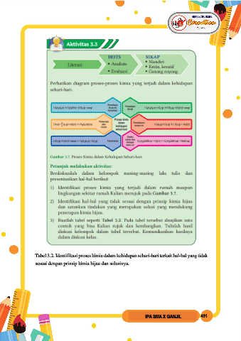 Tabel 3.2. Identifikasi proses kimia dalam kehidupan sehari-hari terkait hal-hal yang tidak sesuai dengan prinsip kimia hijau dan solusinya. IPA SMA X GANJIL 491
