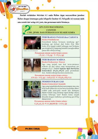 Setelah melakukan Aktivitas 4.1 maka Kalian dapat mencocokkan jawaban Kalian dengan keterangan pada infografis Gambar 4.2. Infografis ini memuat salah satu contoh dari setiap ciri, jenis, dan persamaan reaksi kimianya. 500 IPA SMA X GANJIL