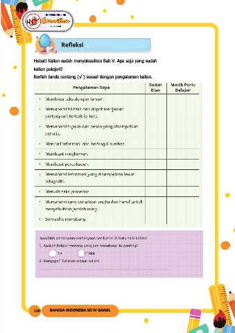 Hebat! Kalian sudah menyelesaikan Bab V. Apa saja yang sudah kalian pelajari? Berilah tanda centang (√ ) sesuai dengan pengalaman kalian. 120 BAHASA INDONESIA SD IV GANJIL