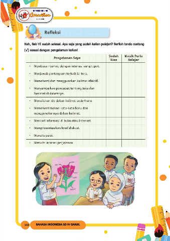 Nah, Bab VI sudah selesai. Apa saja yang sudah kalian pelajari? Berilah tanda centang (√) sesuai dengan pengalaman kalian! 142 BAHASA INDONESIA SD IV GANJIL