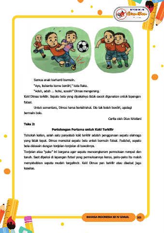 Kaki Dimas terkilir. Sepatu bola yang dipakainya tidak cocok digunakan untuk lapangan